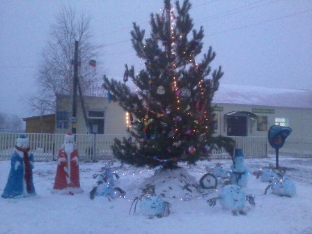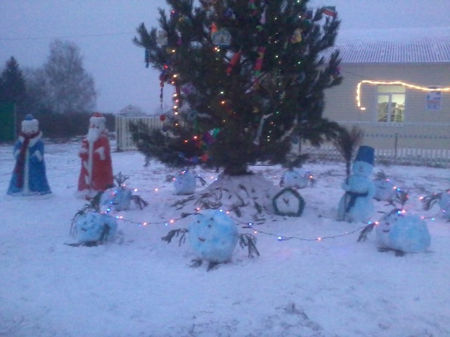 Слепили Деда Мороза и Снегурочку из снега, а так же снеговика. Вылепили часы и еще несколько фигур. Все это покрасили красками.