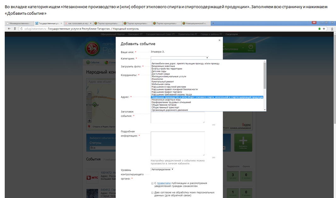 Материальные выплаты в размере от 1 до 3 тыс. рублей могут получить все граждане Республики Татарстан. Для этого необходимо в раздел «Народный контроль» «Добавить событие» о нарушении законодательства в сфере производства и оборота этилового спирта, алкогольной и спиртосодержащей продукции на территории Республики Татарстан. Уполномоченные должностные лица в рамках предоставленных полномочий проведут проверку уведомлениям о нарушениях. После подтверждения факта нарушения Госалкогольинспекцией Республики Татарстан будет осуществлена выплата заявителям.