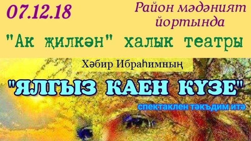 7 нче декабрь көнне,14.00 сәгатьтә мәдәният йортында, инвалидлар декадасы уңаеннан, “Ак җилкән” халык театры артистлары тарафыннан, Хәбир Ибраһим әсәре буенча сәхнәләштерелгән “Ялгыз каен күзе” (мелодрама) спектакле тәкъдим ителәчәк! Керү ирекле.