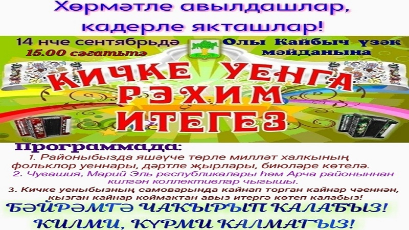 14 сентябрьдә 15:00 сәгатьтә "Сабантуй" мәйданында "Кичке уен" бәйрәме узачак. Барыгызны да көтеп калабыз!